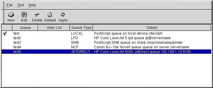 The new printer will appear in the printer list in the main window. Click the Apply button in the main window to save your changes to the /etc/printcap configuration file and restart the printer daemon (lpd). After applying the changes, print a test page to ensure the configuration is correct. Refer to the section called Printing a Test Page for details.