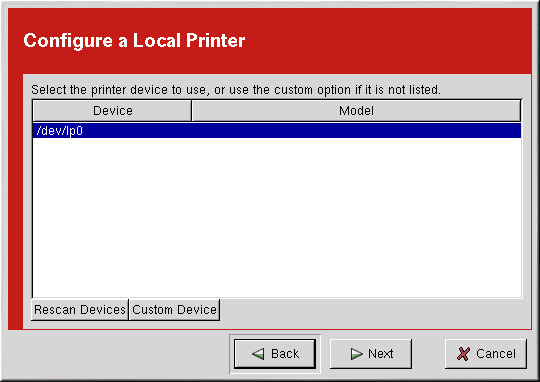 printconf attempts to detect your printer device and display it as shown in Figure 7-4. If your printer device is not shown, click Custom Device. Type the name of your printer device and click OK to add it to the printer device list. After selecting your printer device, click Next.