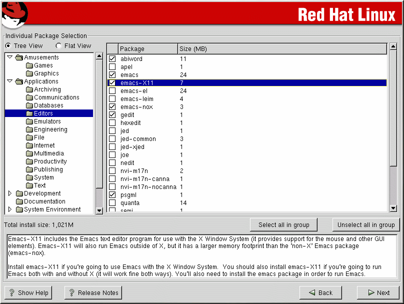 You can also select or deselect all packages listed within a particular group, by clicking on the Select all in group or Unselect all in group buttons.