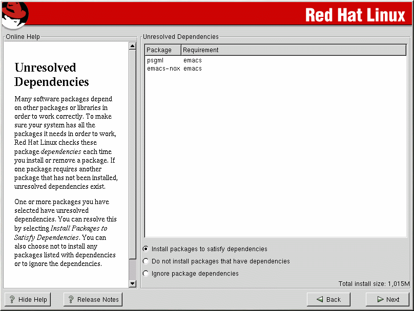 If any package requires another package which you have not selected to install, the program presents a list of these unresolved dependencies and gives you the opportunity to resolve them (see Figure A-6).