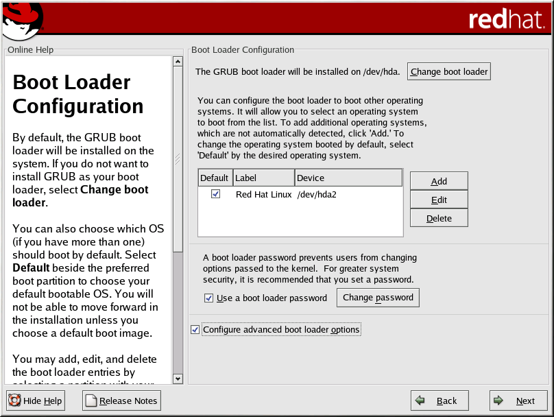 If you are installing a boot loader, you should create a password to protect your system. Without a boot loader password, users with access to your system can pass options to the kernel which can compromise your system security. With a boot loader password in place, the password must first be entered in order to select any non-standard boot options.